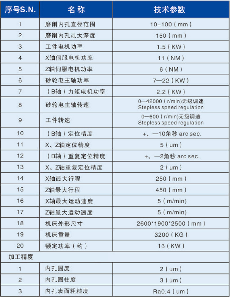 ●本机床为三轴(X进给、Z砂轮、B分度轴)数控内圆磨床,主要用于磨削工件的内圆孔、内锥孔、内端面、外端面的磨削。磨削循环均自动完成(具有自动进刀、退刀、粗磨、精磨;自动修正砂轮、自动补偿等功能)。