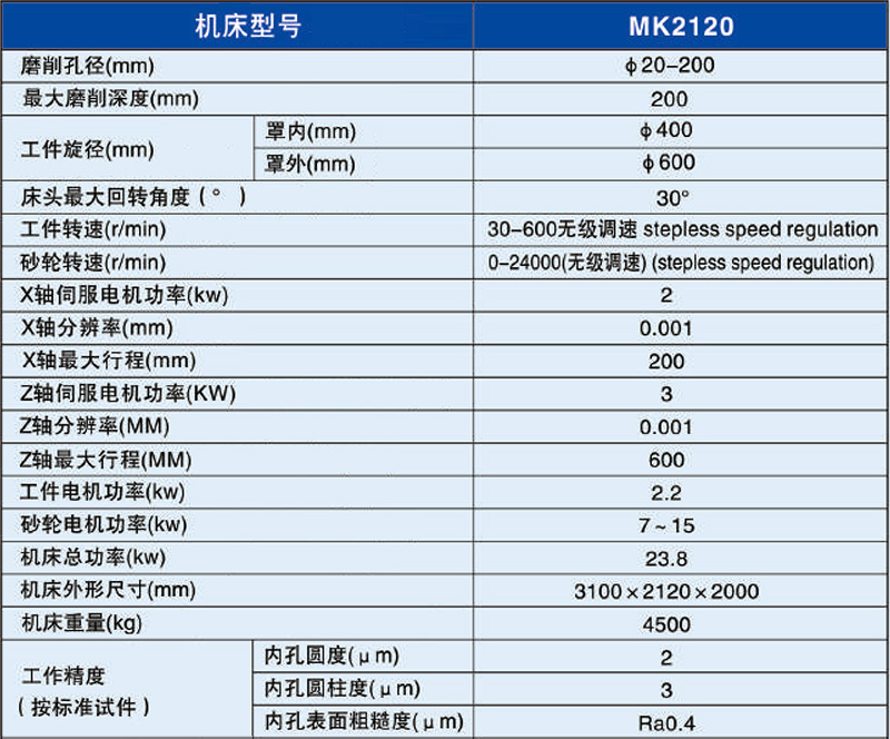 主要用途及结构特点:●本机床为二轴(X轴、Z轴)数控内圆磨床,主要用于磨削工件的内圆孔、台阶孔、内端面、外端面。磨削循环均自动完成(具有自动进刀、退刀、粗磨、精磨;自动修正砂轮、自动补偿等功能)。●机床采用工件箱前后进给,工作台(砂轮架)左右运动的结构方式,工件箱进给及砂轮架运动导轨均为直线滚动导轨,移...